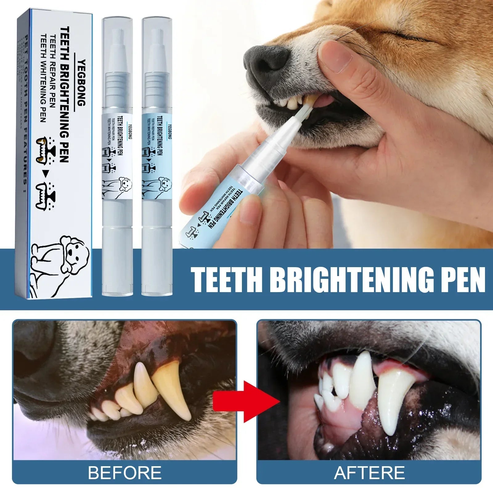 1. Pet tooth whitening white pen- can penetrate into the gums, remove tartar and stubborn dental stains on the teeth, soften the teeth on the calculus, make the calculus lose and fall off and blue pen-dental care formula, all-round care of oral and gums, anti-inflammatory and bacteriostasis, repair gums, strong teeth, so that teeth more bright and white luster, contains natural plant fresh oral formula, so that the mouth is fresh and natural.